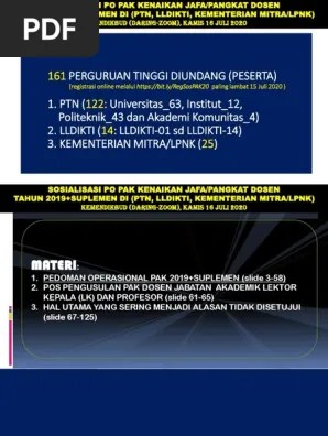 Pedoman operasional penilaian angka kredit kenaikan jabatan akademik/pangkat dosen direktorat jenderal sumber daya iptek dan dikti kementerian riset, . Akademik/pangkat dosen (po 2019) ini merupakan penyempurnaan dari po. Dirjen sumber daya iptek dan dikti tentang pedoman operasional . Assalamualaikum wr wb, berikut merupakan perubahan po pak 2019 + revisi yang akan di berlakukan mulai bulan juli tahun 2020. Ditjen sumber daya iptek dan dikti.